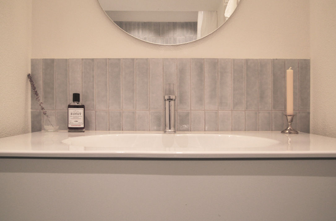 Erfrischend neuinterpretiert und modern kombiniert erinnern die ausgewählten Fliesen, Farben und Möbel an das Baujahr des Hauses 1908. Durch die Umplanung der Küche entstand mehr Stauraum und eine effizientere Nutzung des Raumes. Die neue einseitige Küchenzeile ermöglicht eine zusätzliche Sitznische inklusive einem Regal.